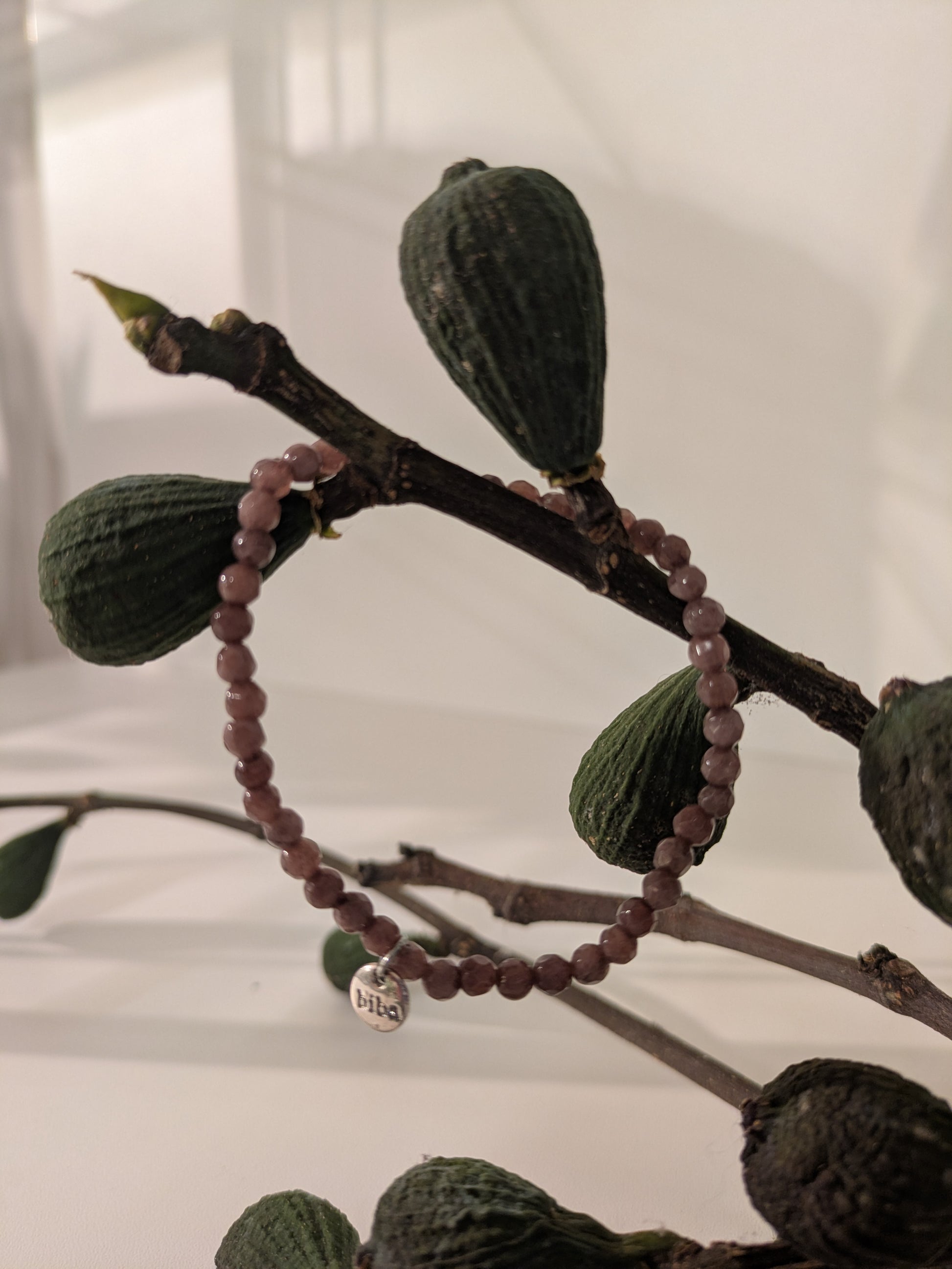 Das Armband hat ein silbernes Emblem mit dem Schriftzug Biba.