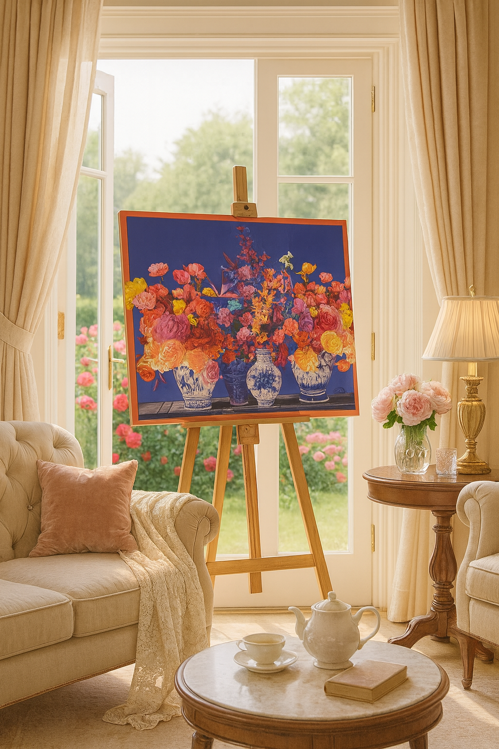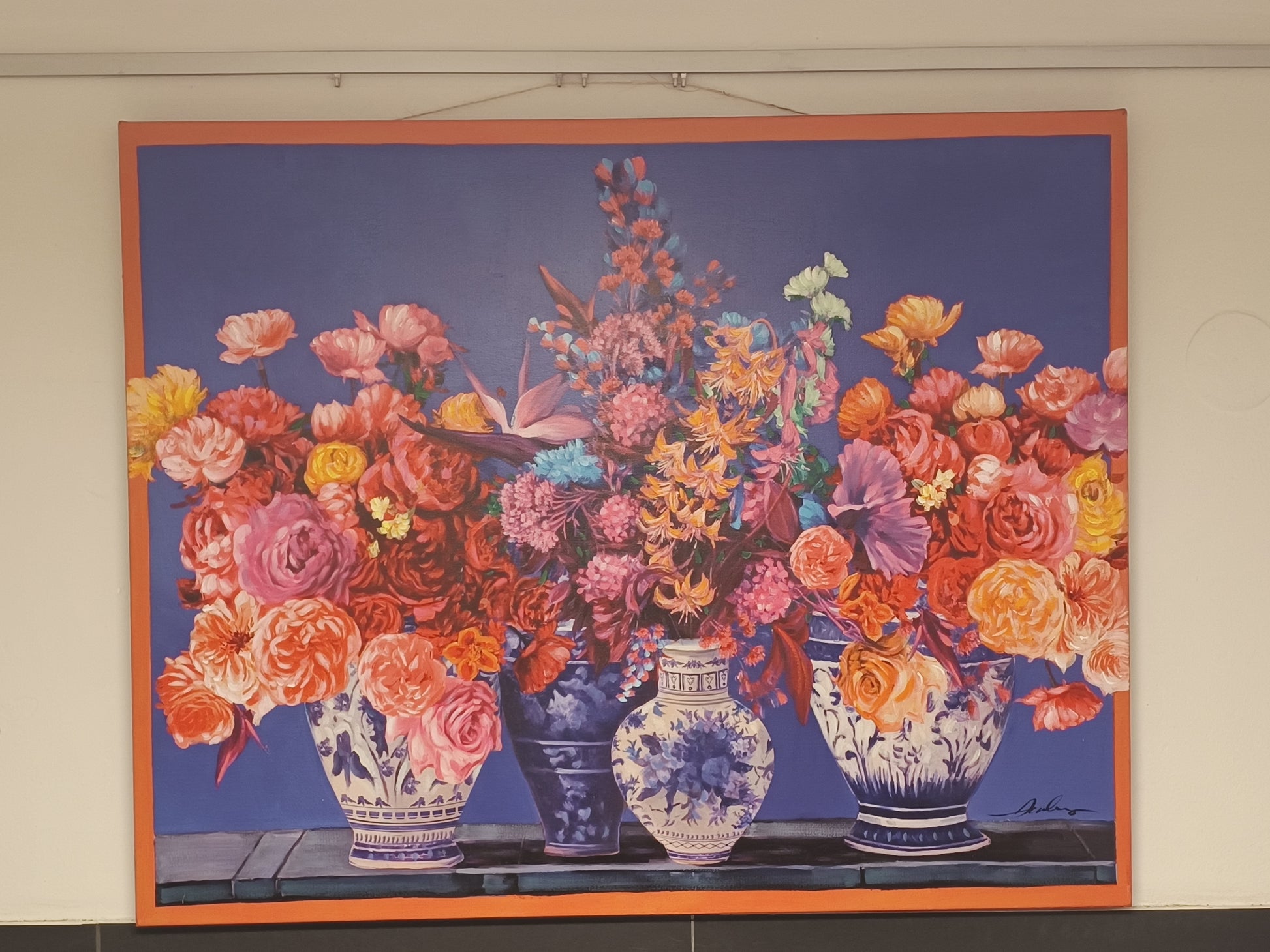 Jedes Detail - von der feinen Blütenblättern bis zu den filigranen Mustern der Vasen - ist mit großer Sorgfalt handbemalt und ausgearbeitet. Das Bild strahlt Wärme, Freude und eine moderne Eleganz aus, die jeden Raum veredlet - ob Wohnzimmer, Essbereich, Büro oder Flur.