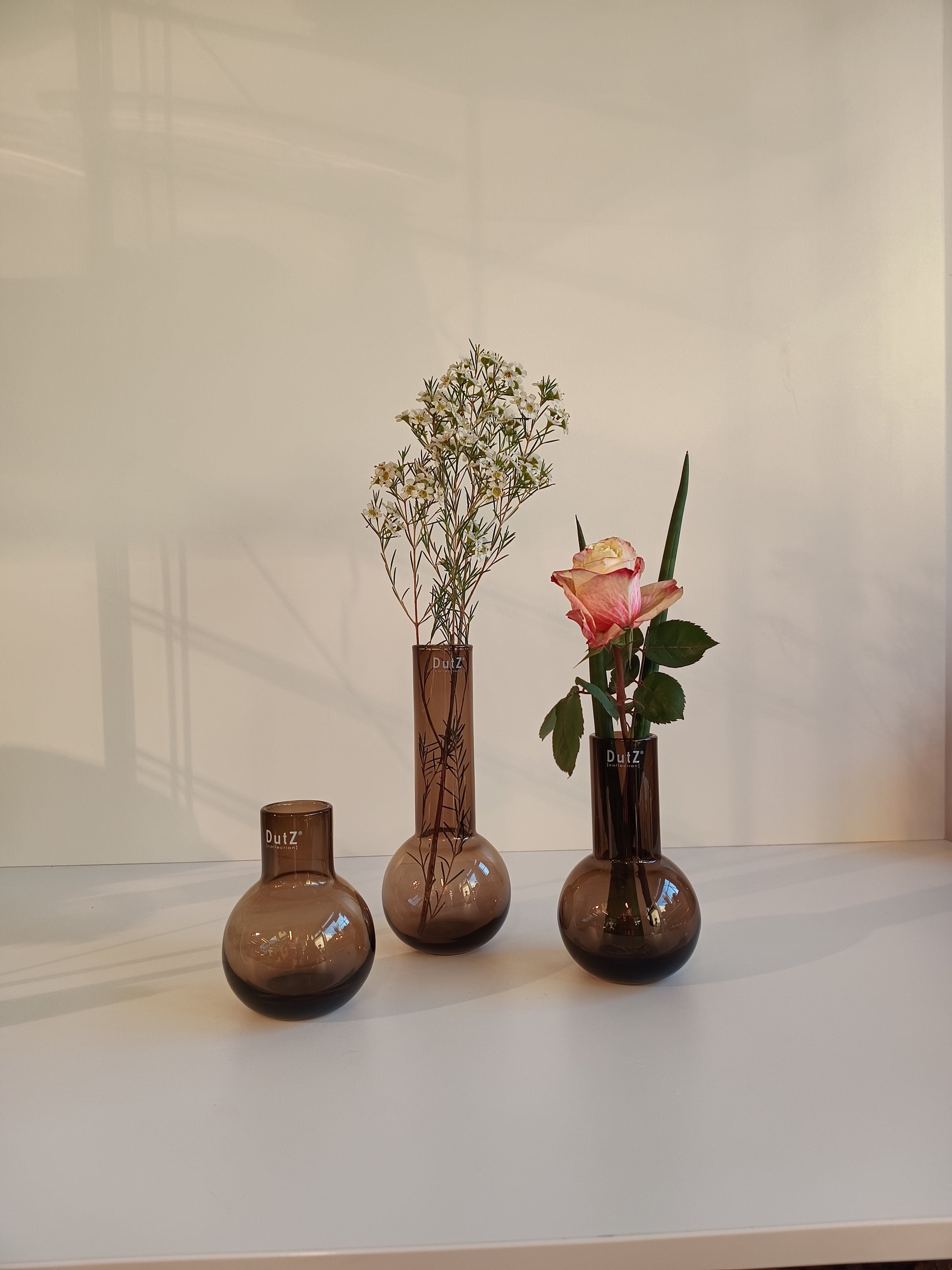 Das warme Rachbraun des Glases harmoniert wunderbar mit zarten Blumen, grünen Zweigen oder einzelnen Rosen und schaftt ein ruhiges, edles Ambiente. Jede Vase ist ein Unikat, handgefertigt aus hiochwertigem Glas und mit feinen Rundungen, die das Licht sanft reflektieren.