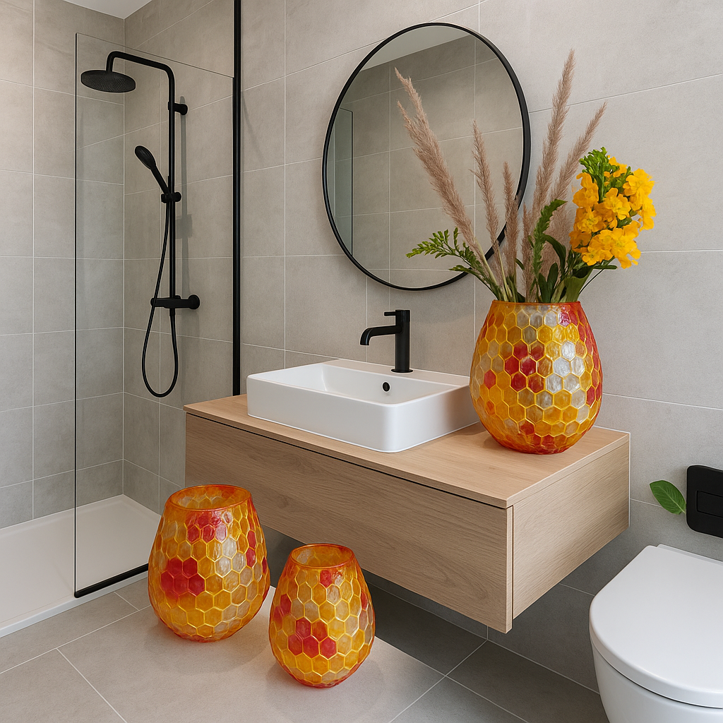 Das Glas "Salimata Yellow Pink" ist ein wunderschönes Windlicht, das mit seinen lebhaften Farben in Gelb und Pink sofort gute Laune verbreitet. Es erinnert an einen sonnigen Sommertag und bringt eine fröhliche Atmosphäre auf deine Terrasse, deinen Balkon oder in deinen Garten.