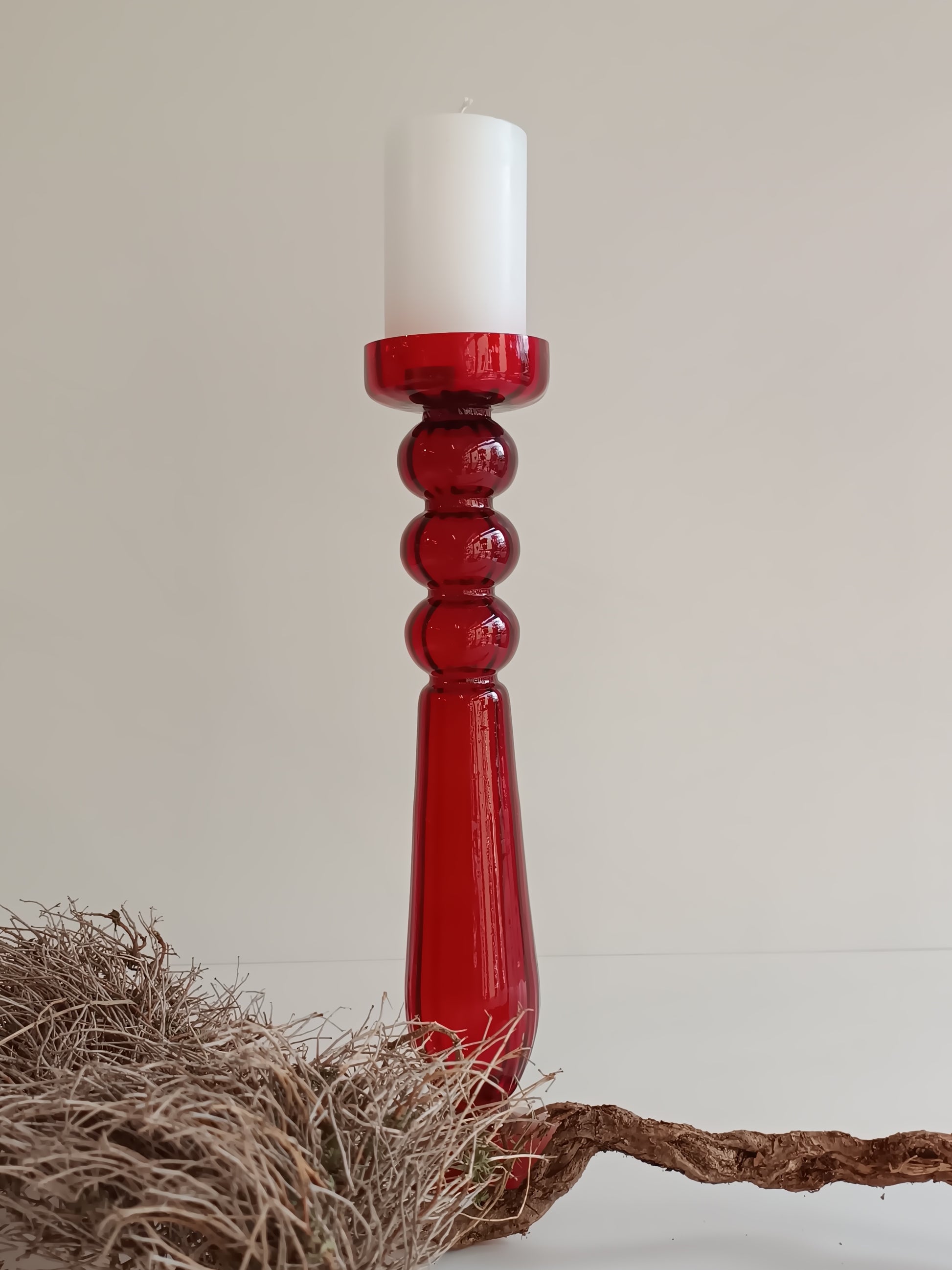 Der elegante Kerzenleuchter aus rotem Glas ist ein wahrhaftes Statement-Stück, das jedem Raum eine besondere Note verleiht. Mit seiner tiefen, satten Farbe strahlt er Wärme und Leidenschaft aus und zieht sofort die Blicke auf sich. Die geschwungene Form und die feinen Details des Designs verleihen dem Leuchter eine anmutige Eleganz. Ideal für festliche Anlässe oder romantische Abende, bringt dieser Kerzenleuchter eine luxuriöse und einladende Stimmung in dein Zuhause. Ob auf dem Esstisch, dem Kaminsims oder als Teil einer dekorativen Anordnung – er setzt immer einen stilvollen Akzent.
