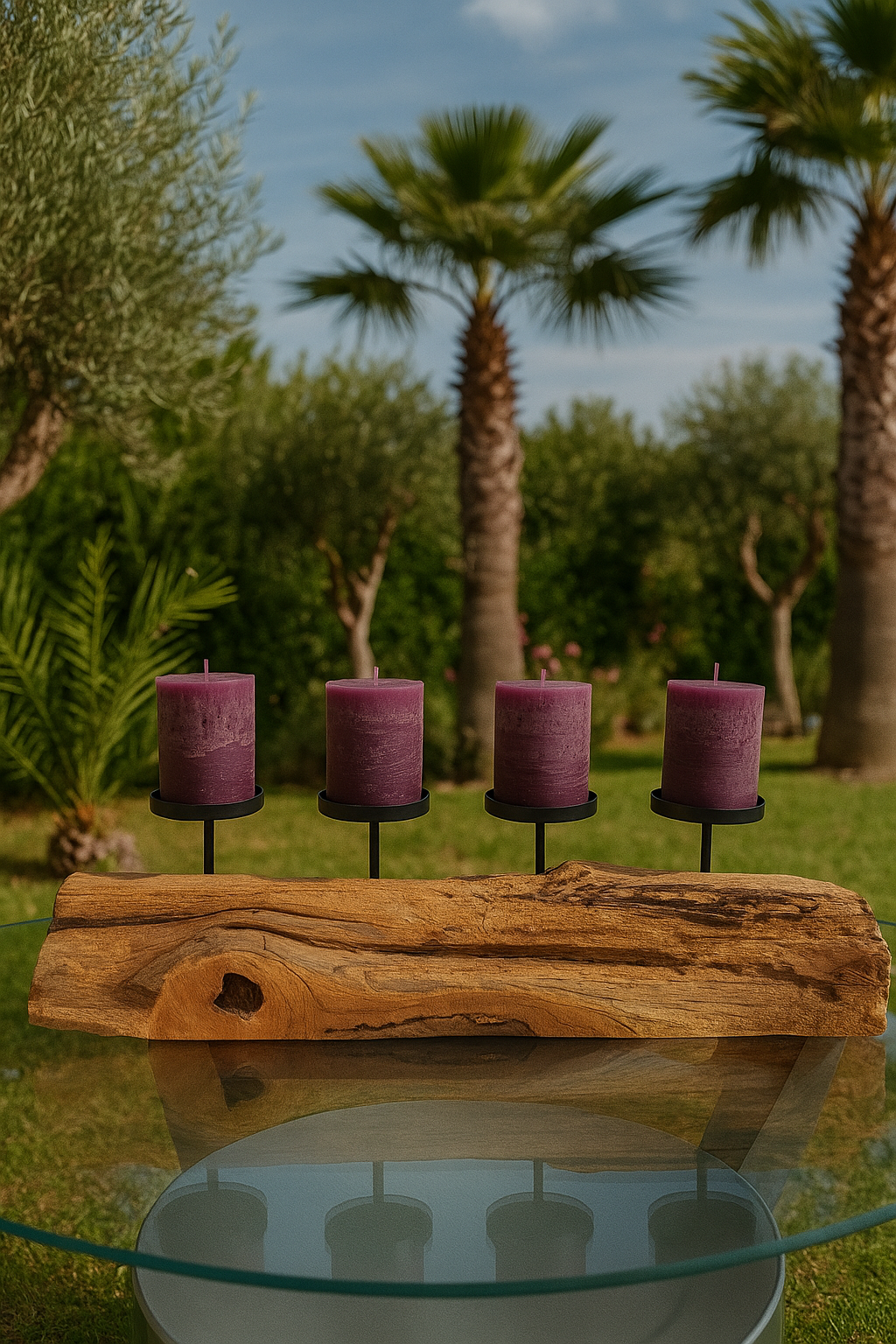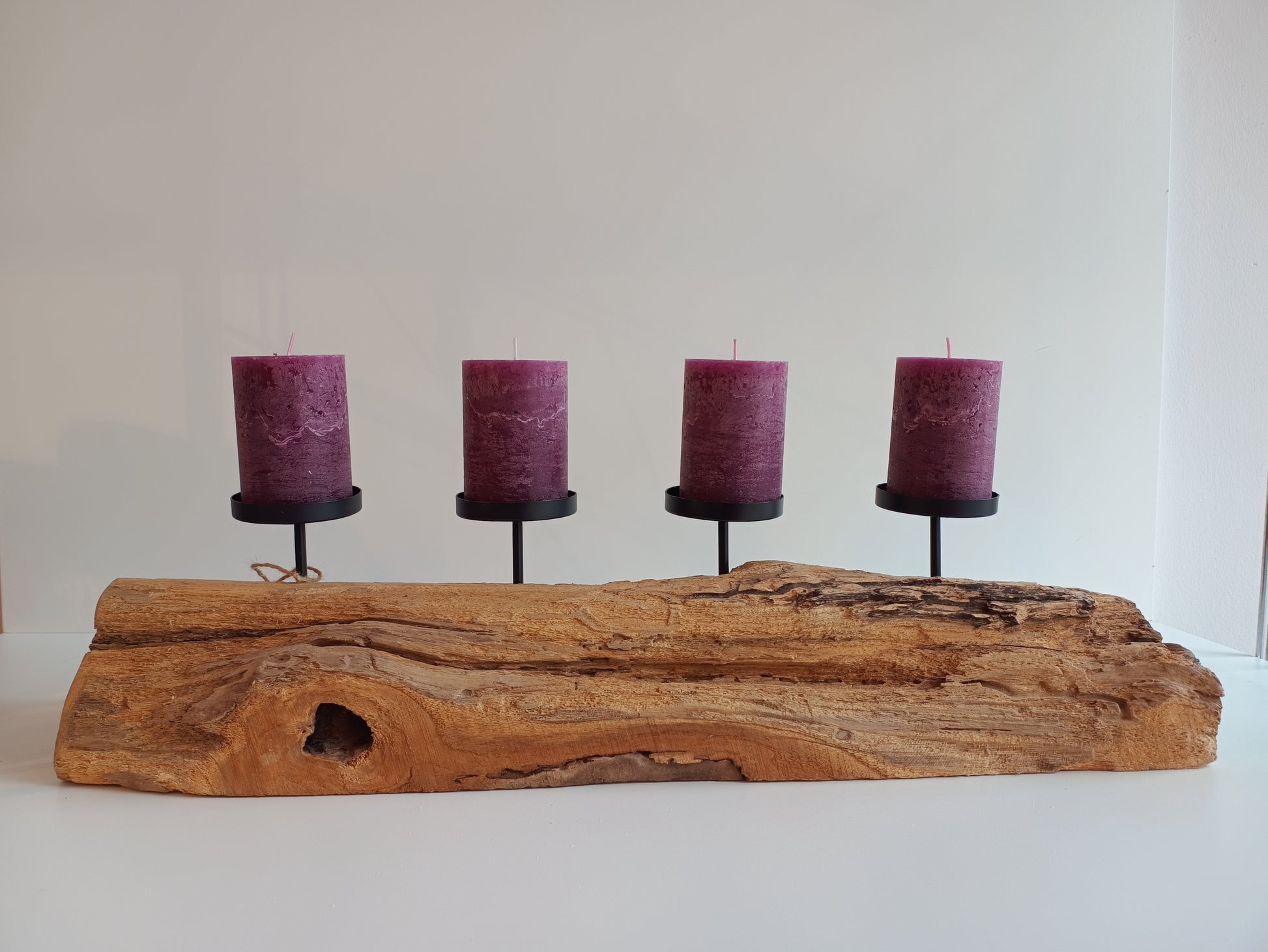 Dieser Kerzenständer bietet Platz für vier Stumpenkerzen, die harmonisch in die natürliche Struktur des Holzes integriert sind. Die Kerzen können in verschiedenen Farben gewählt werden, um einen schönen Kontrast zum warmen Holz zu schaffen oder um eine stimmige, monochrome Atmosphäre zu erzeugen. Wenn die Kerzen brennen, erzeugen sie ein sanftes, warmes Licht, das die Textur des Treibholzes noch mehr zur Geltung bringt und eine gemütliche, einladende Stimmung schafft.
