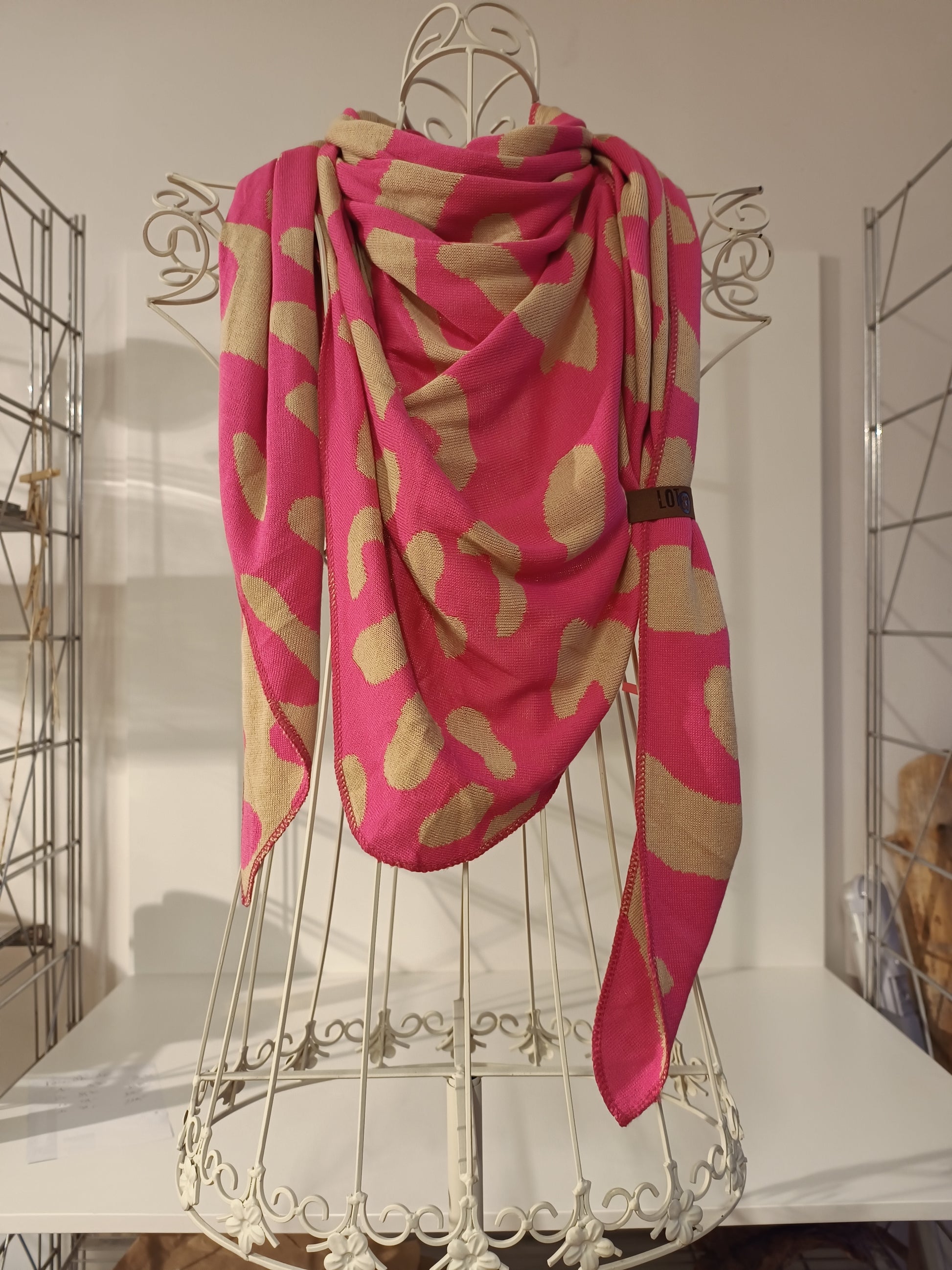 Ein echtes Statement-Piece: Dieser weiche Strickschal begeistert mit seinem auffälligen Leo-inspierten Muster in leuchtendem Pink und warmen Beige.