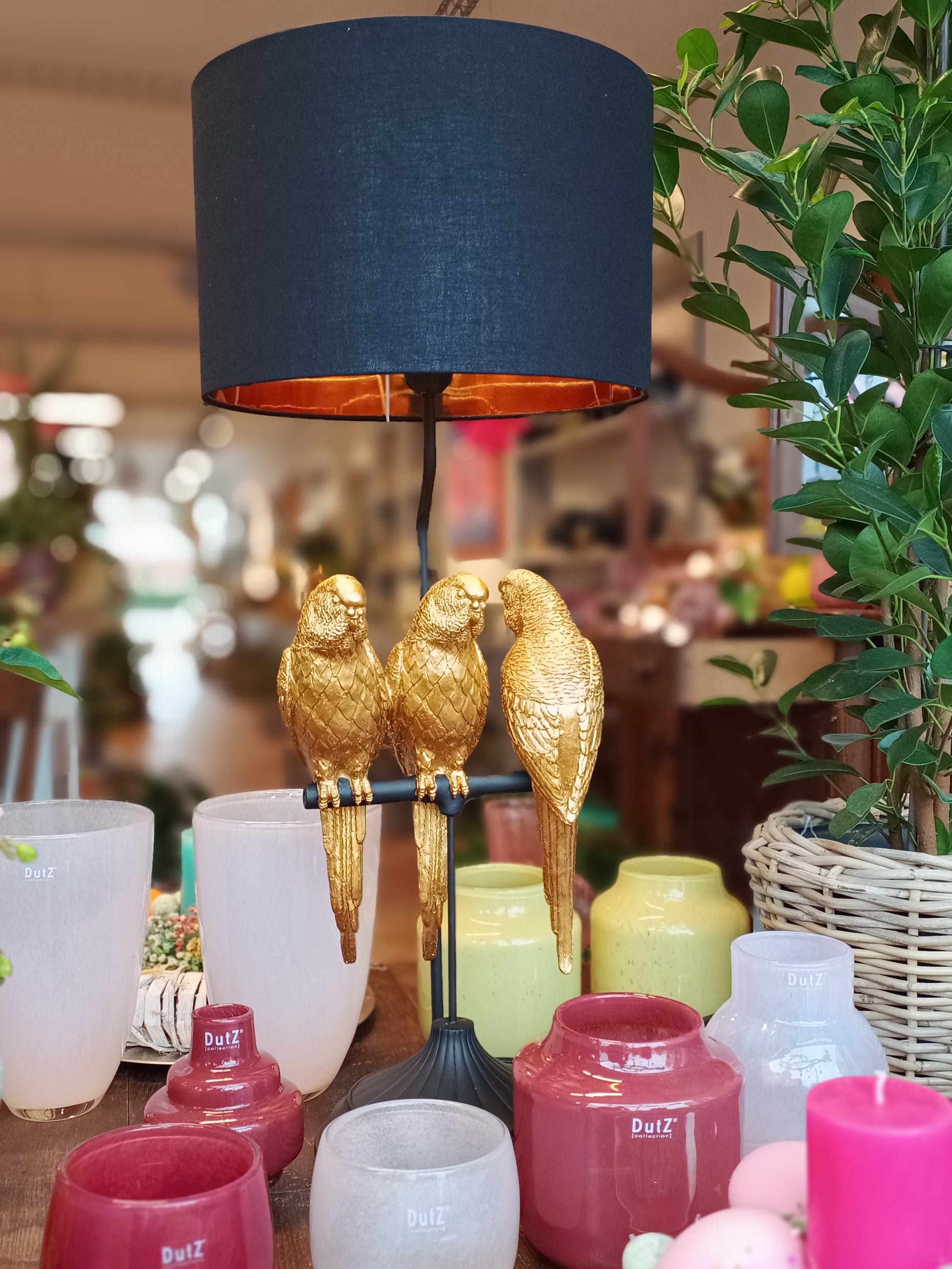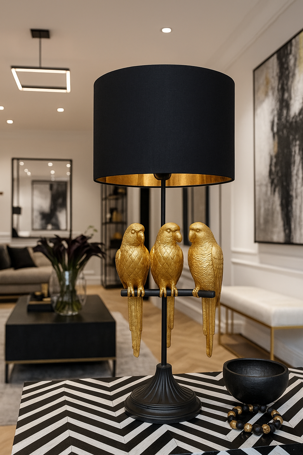 Die Tischleuchte mit den drei goldenen Papageien ist ein wahrhaft einzigartiges Stück, das sowohl Eleganz als auch einen Hauch von Verspieltheit in jeden Raum bringt. Die Papageien, in einem strahlenden Goldton gehalten, scheinen fast lebendig und verleihen der Leuchte eine fröhliche, freche Note. Der schwarze Lampenschirm kontrastiert perfekt mit dem goldenen Design und sorgt dafür, dass das Licht sanft und stimmungsvoll verteilt wird. Diese Kombination aus witzigen, lebhaften Elementen und der eleganten Form macht die Tischleuchte zu einem echten Blickfang, der sowohl in modernen als auch in klassischen Einrichtungsstilen hervorragend zur Geltung kommt. Sie ist nicht nur eine Lichtquelle, sondern auch ein Kunstwerk, das Gespräche anregt und Freude verbreitet.