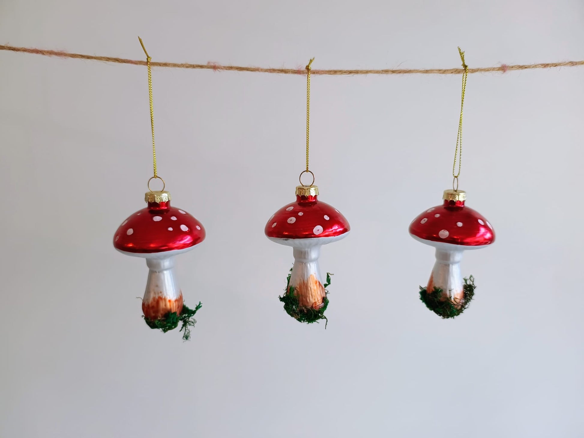 Diese außergewöhnlichen Anhänger in Form von kleinen Fliegenpilzen bringen nicht nur Farbe, sonder auch eine Portion Glück an Ihren Weihnachtsbaum. Mit ihren leuchtend roten Kappen, weißen Punkten und leiebvoll gestalteten Details sind die ein echter Hingucker - ob am klassischen Baum, am weißen Kunsttannenbaum oder als verspielte Fensterdeko.