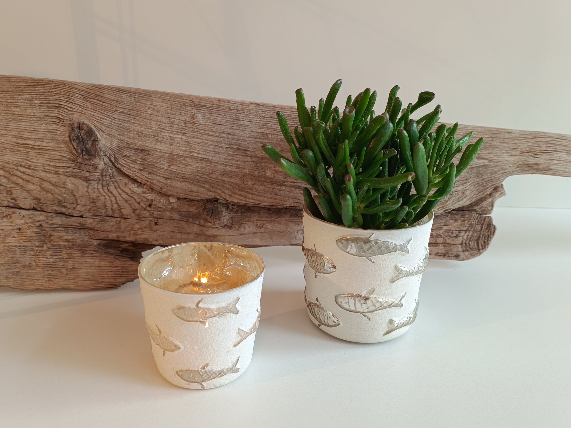 - Das Windlicht in Weiß mit silbernen Fischen strahlt eine elegante Sommeratmosphäre aus. Es besteht aus hochwertigem Glas, das das Licht sanft reflektiert und eine warme, einladende Stimmung schafft. Die silbernen Fische, die kunstvoll auf dem Windlicht gestaltet sind, verleihen dem Stück einen maritimen Charme und erinnern an entspannte Tage am Meer. Ideal für laue Sommerabende, sorgt dieses Windlicht für eine stimmungsvolle Beleuchtung und bringt ein Stück Küstenfeeling in dein Zuhause. Es ist perfekt für den Einsatz auf dem Tisch, auf der Terrasse oder im Garten und schafft eine harmonische Verbindung zur Natur.