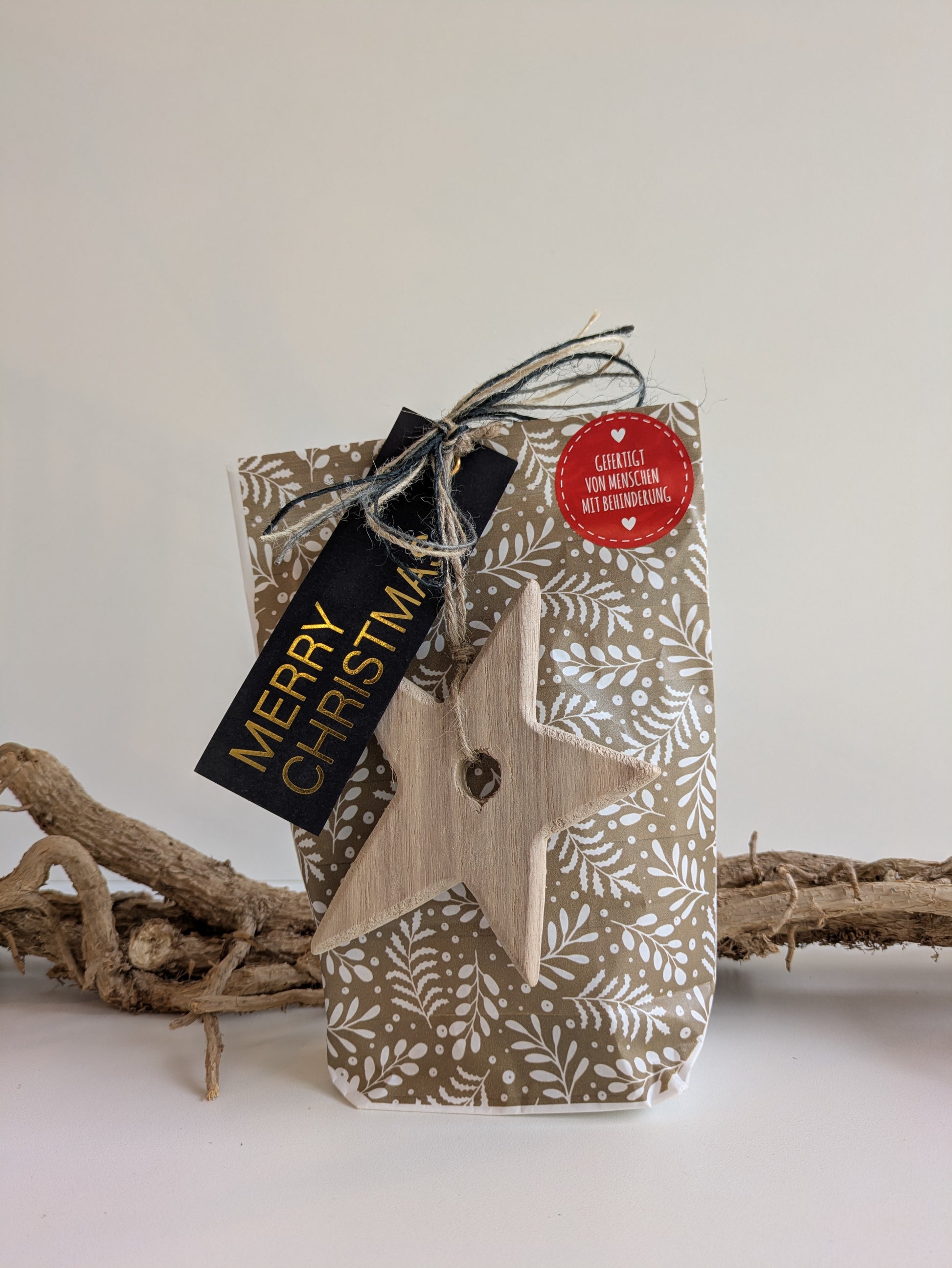 Inhalt: Spruchkarte, handgefertigter Holzstern außen, Holzsterne zum Aufstellen- Pinienzapfen zum Dekorieren